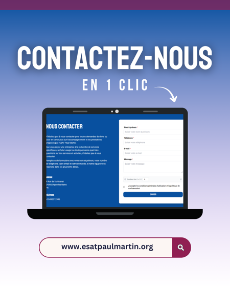 Êtes-vous intéressé par nos services ou avez-vous des questions concernant l'ESAT Paul Martin ? Notre équipe est prête à vous fournir toutes les informations nécessaires. Remplissez le formulaire de contact avec votre demande, et nous vous répondrons dans les plus brefs délais. Que ce soit pour des renseignements sur nos activités, nos horaires, ou pour toute autre préoccupation, n'hésitez pas à nous joindre. Nous sommes là pour vous aider à mieux comprendre notre engagement envers le bien-être et l'intégration professionnelle de nos bénéficiaires.